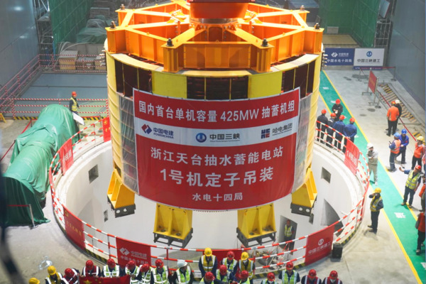 3月24日,浙江天臺抽水蓄能電站首臺(1號)機組定子順利吊裝成功、下水庫順利下閘蓄水,標志著這項重大新能源工程取得兩項突破性進展,由此邁入建設攻堅的關鍵階段。 電站首臺發電機定子機座高6.36米,最大直徑8.05米,鐵芯由15.2萬張0.5毫米厚的硅鋼片疊裝而成,整體起吊重量為465.5噸,主要由機座、鐵芯、繞組等部件組成,是機組進行機械能與電能轉換的核心部件。水電十四局安裝團隊自2024年10月16日開始機座組圓焊接,在地下廠房安裝間進行組裝、疊片、線棒下線、耐壓試驗等數十道安裝工序,所有裝配檢測和試驗驗證數據優良,一次性通過所有檢測,提前37天完成施工任務。本次吊裝采用2臺300噸橋機進行并車吊裝,吊裝前進行了細致檢查、交底、試吊等,過程中嚴格按照吊裝方案執行,切實履行崗位安全生產責任,確保了定子安全順利吊裝到位。 電站下水庫大壩采用混凝土面板堆石壩,大壩高71米,壩頂長度420米,壩頂寬度8米。總庫容1076萬立方米,正常蓄水位庫容936萬立方米、調節庫容718萬立方米。蓄水前,項目部組織人員對庫底建筑余料和腐殖層進行了深度清理。水庫首次蓄水主要依靠截流蓄積和始豐溪引水。為保障庫區水質,后期主要利用“自然補給+循環利用+智慧調控”的形式。既依托天臺山的自然降水優勢,又通過尖端的工程技術實現水資源零浪費。未來,隨著電站全面投運,這套“水、能共舞”系統將成為長三角水資源集約利用的標桿。 該項目總投資107.4億元,額定水頭724米,為全球在建水頭最高,總裝機容量170萬千瓦,其中單機容量全國最大,預計2026年9月全部機組投產發電后,年發電量可達17億千瓦時,每年可節省浙江電網電力系統的燃煤消耗量約52萬噸,減少二氧化碳排放約104萬噸。電站建成后,將承擔浙江電網并兼顧華東電網的調峰、填谷、調頻、調相、儲能及緊急事故備用等任務,對于優化電源結構、提高電網安全穩定運行能力、實現“雙碳”目標具有重要意義。 |