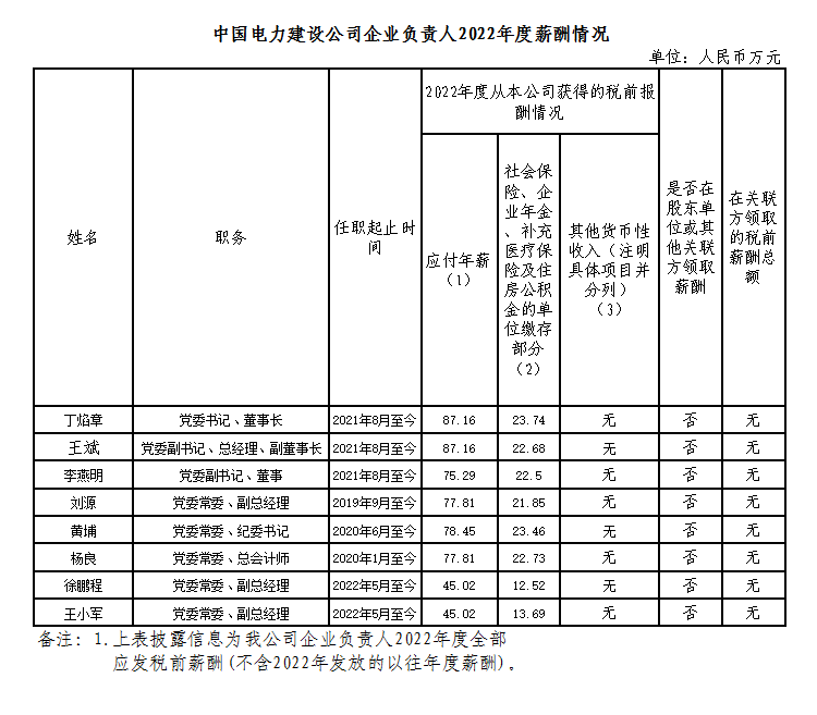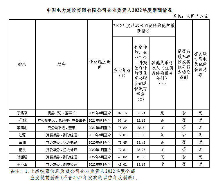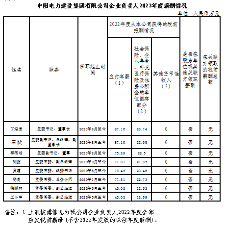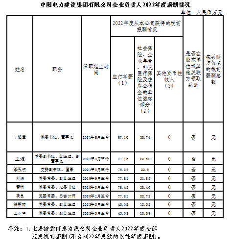 中國(guó)電力建設(shè)集團(tuán)有限公司企業(yè)負(fù)責(zé)人2022年度薪酬情況